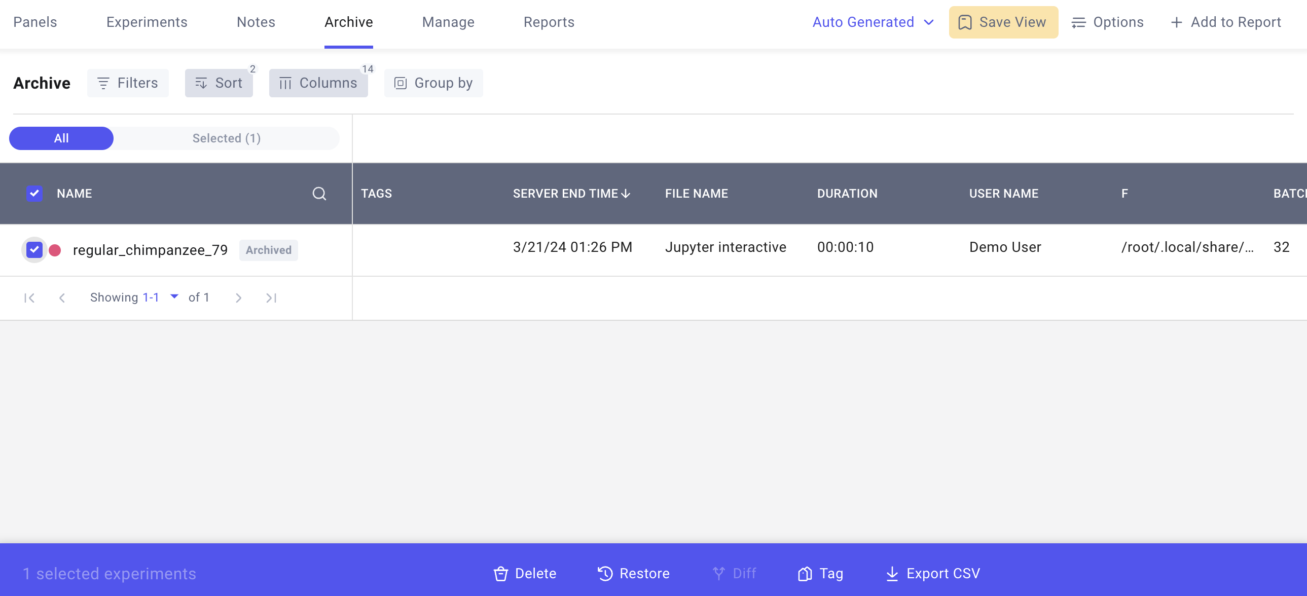 • Archive: Archiving an experiments corresponds to soft-deleting the experiment(s). You can navigate to the Project Archive page to either restore or permanently delete your archived experiments.