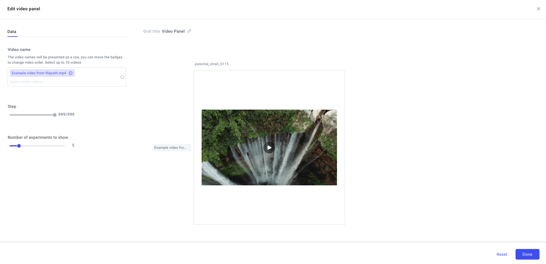 • Data: Select the videos to visualize in the panel.