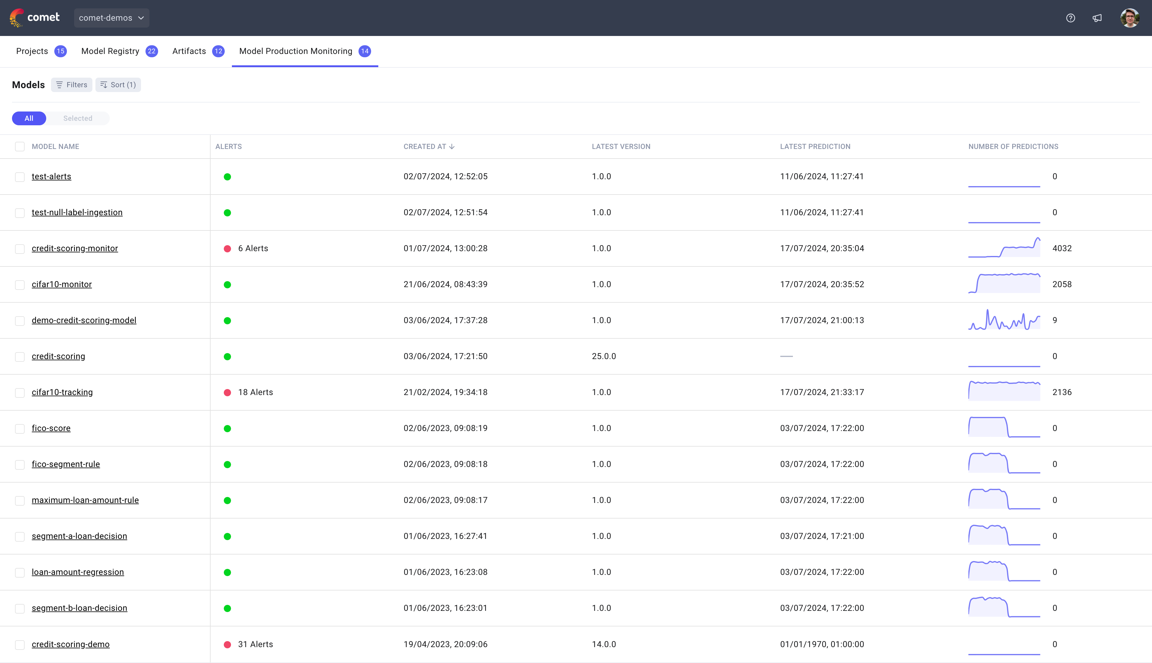The MPM models page displays all models that are being tracked in the MPM platform with some additional information to make it easier to identify which models require your attention. For each model, we will display the number of open alert notifications, when the last prediction was made as well as the number of predictions made over the last 30 days.